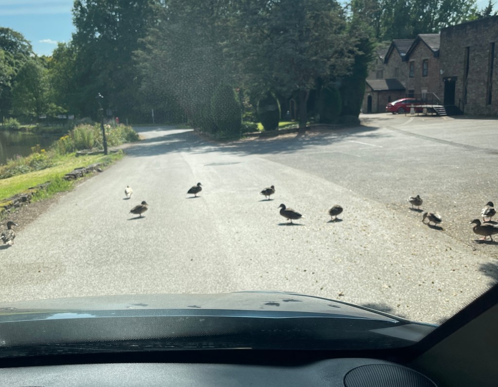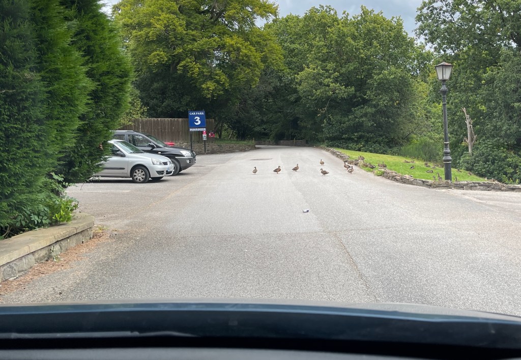 These ducks usually stay in the pond but on this day they wanted to explore. Beeping my horn didn’t affect them at all. After about a minute or so they finally got off the road.
